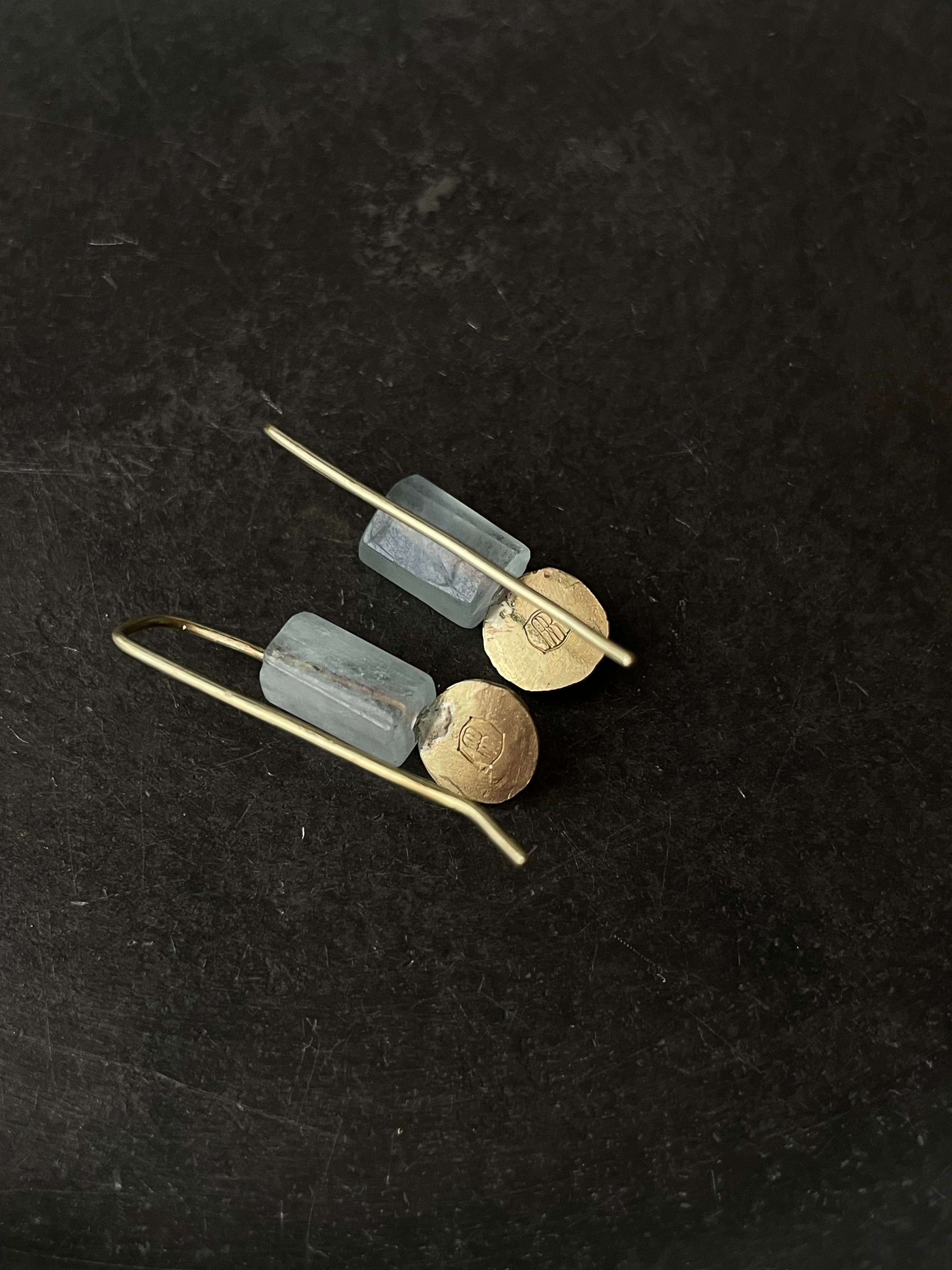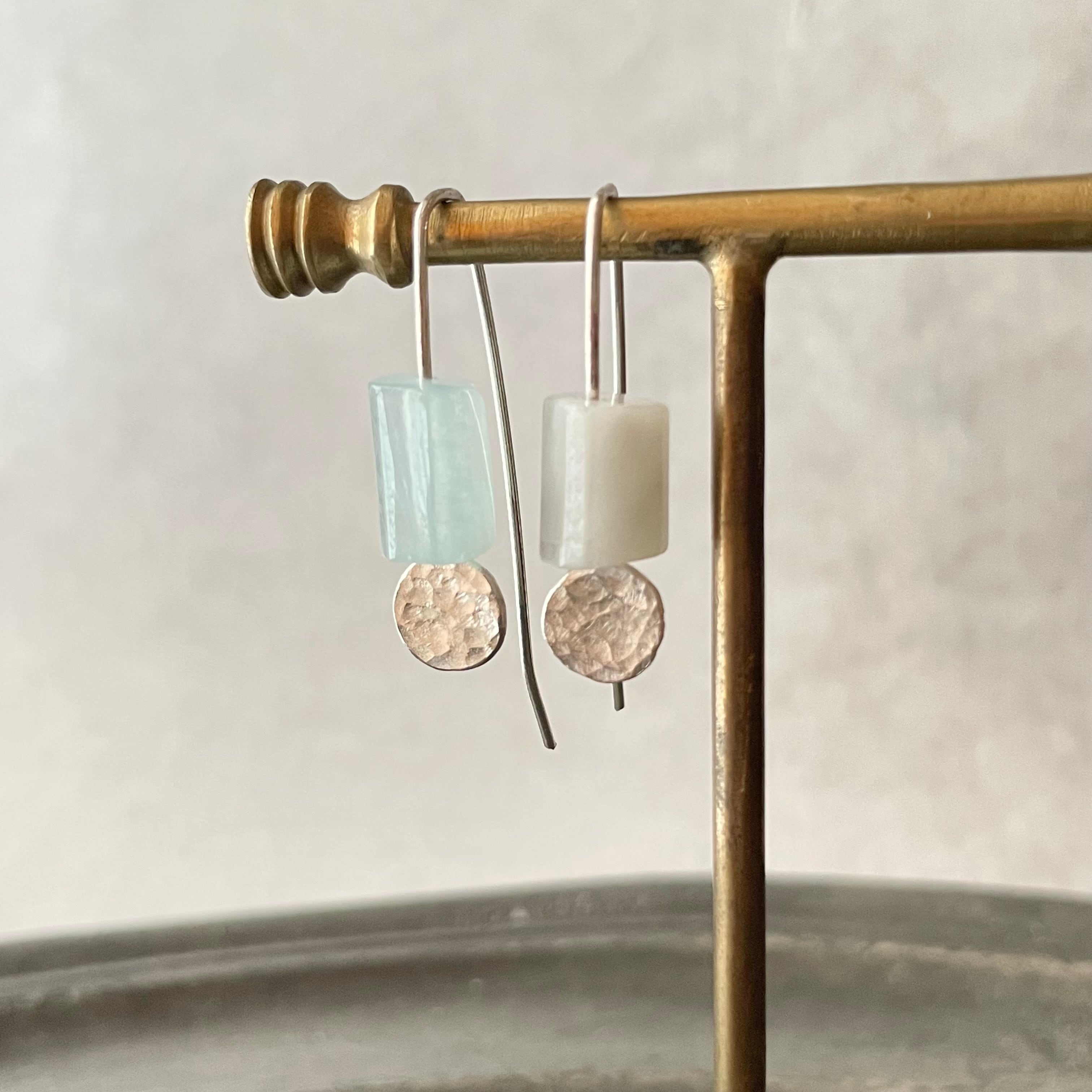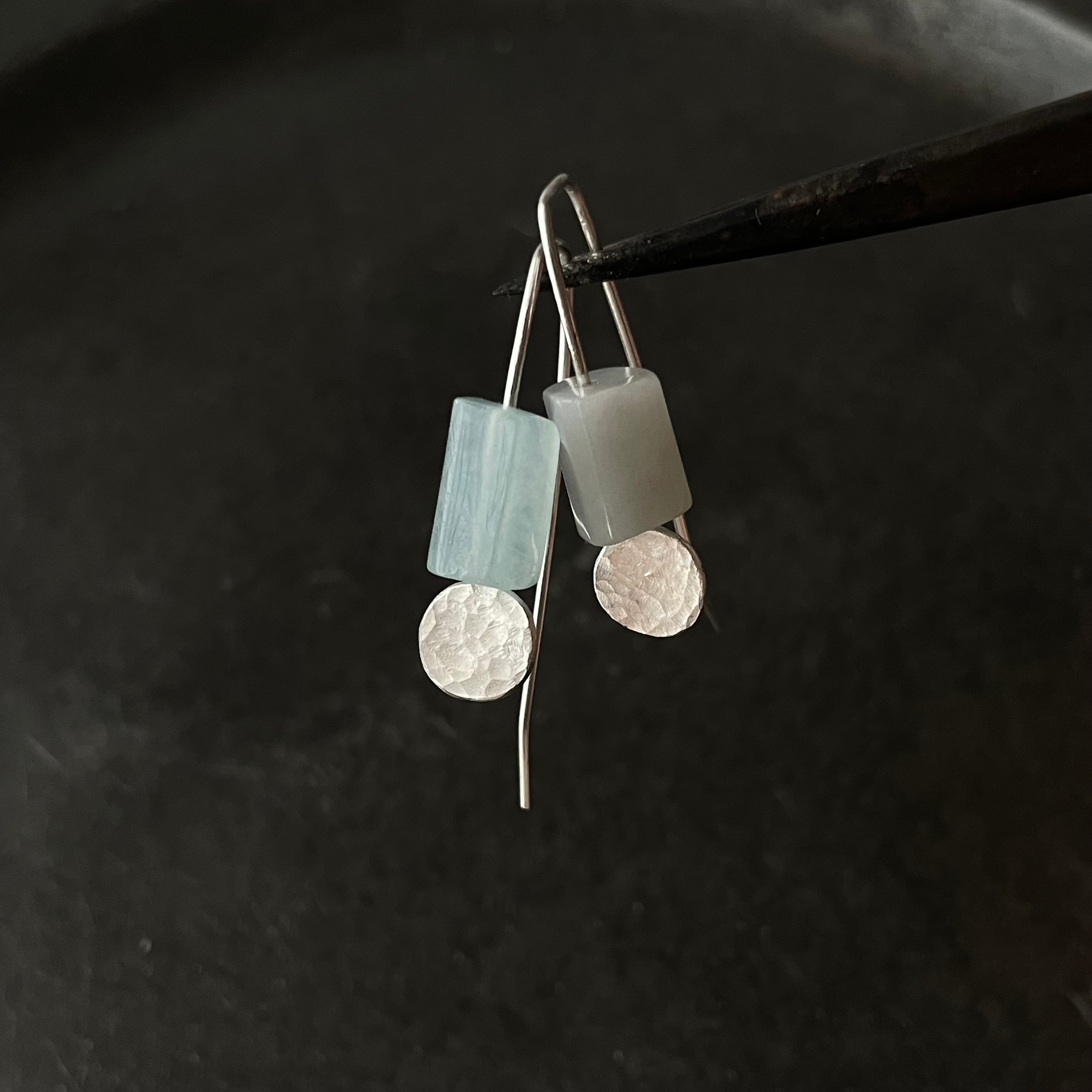 アクアマリンと槌目をつけた銀板と真鍮板を合わせたシンプルなピアスです。