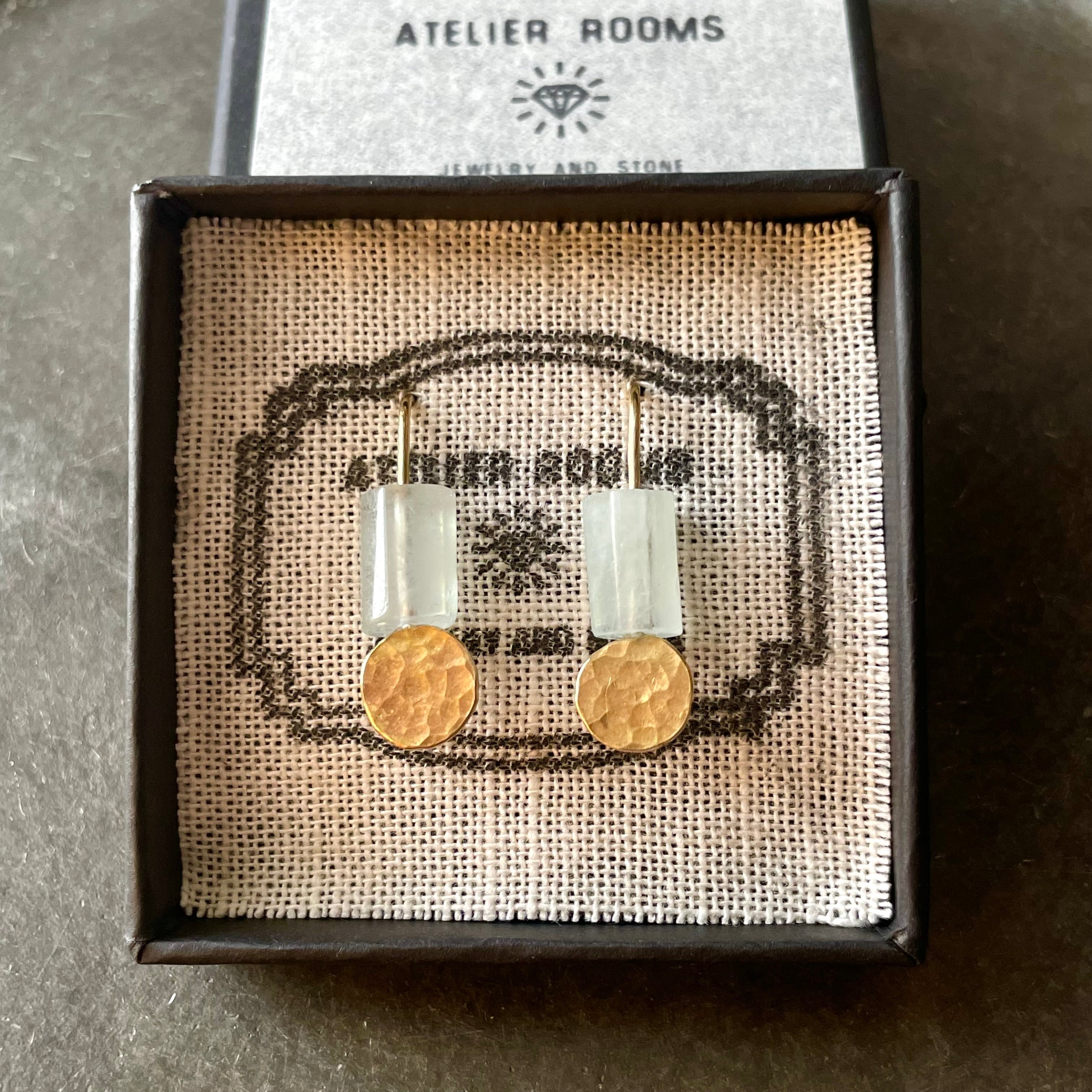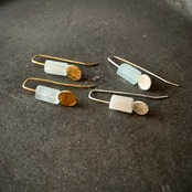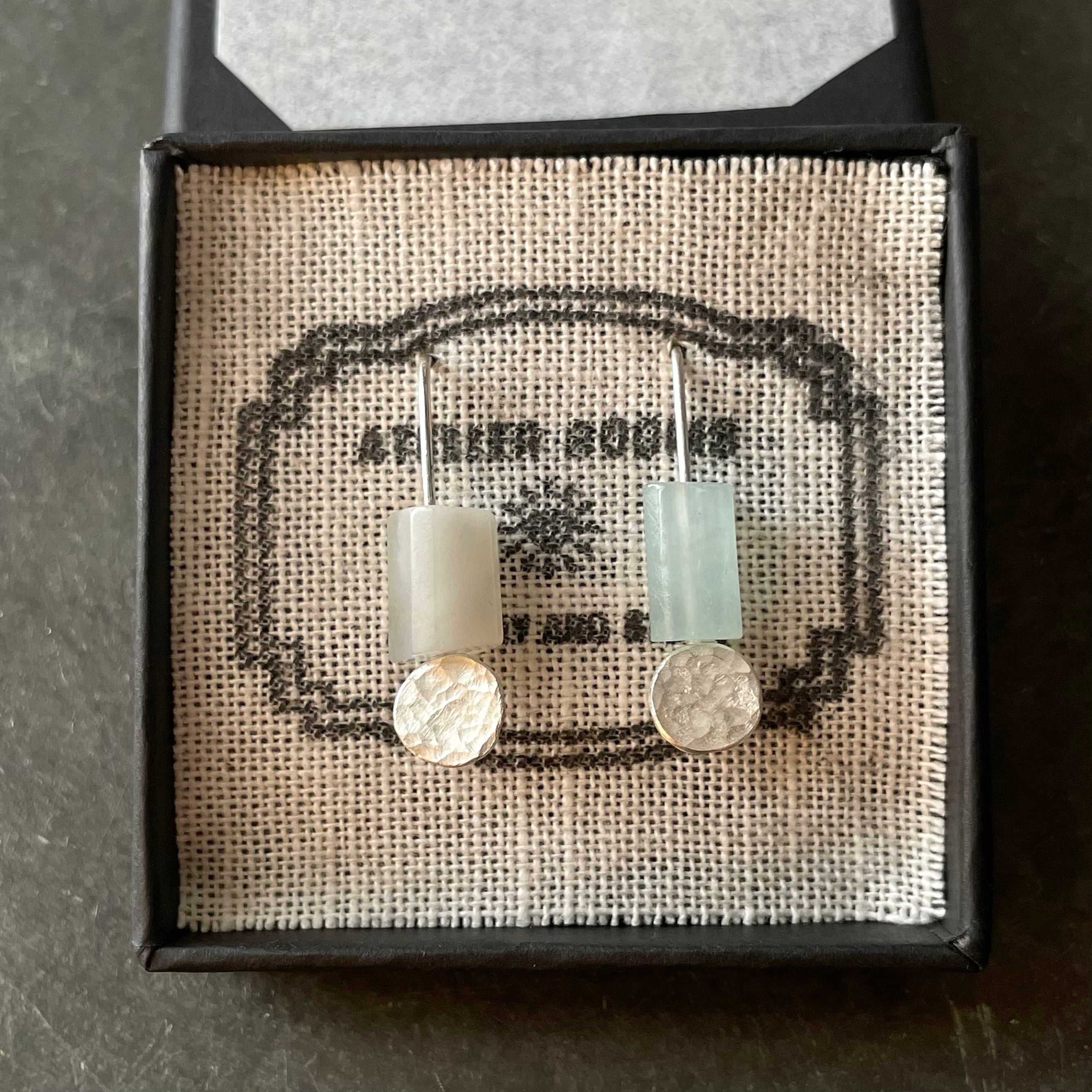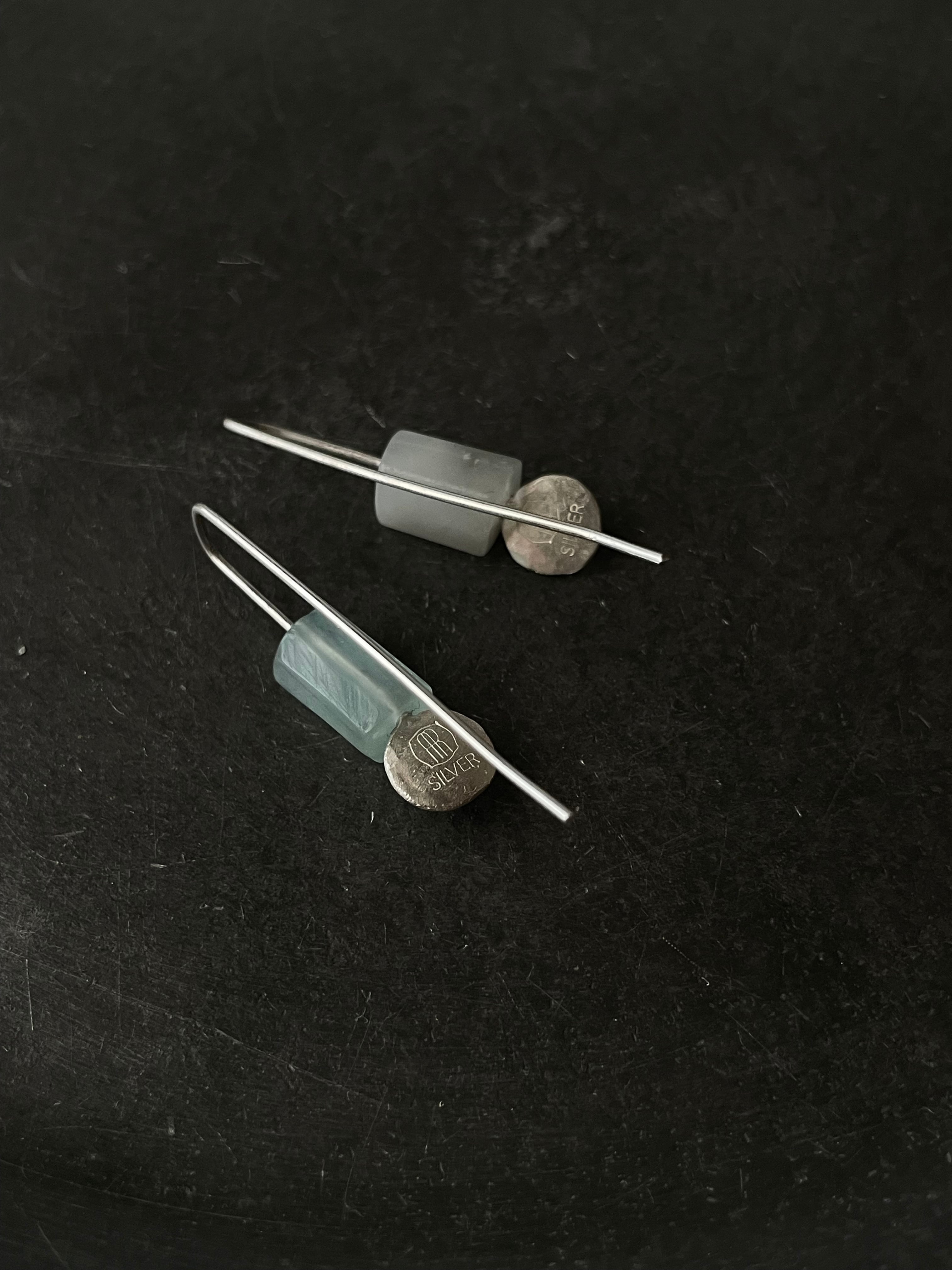 アクアマリンと槌目をつけた銀板と真鍮板を合わせたシンプルなピアスです。