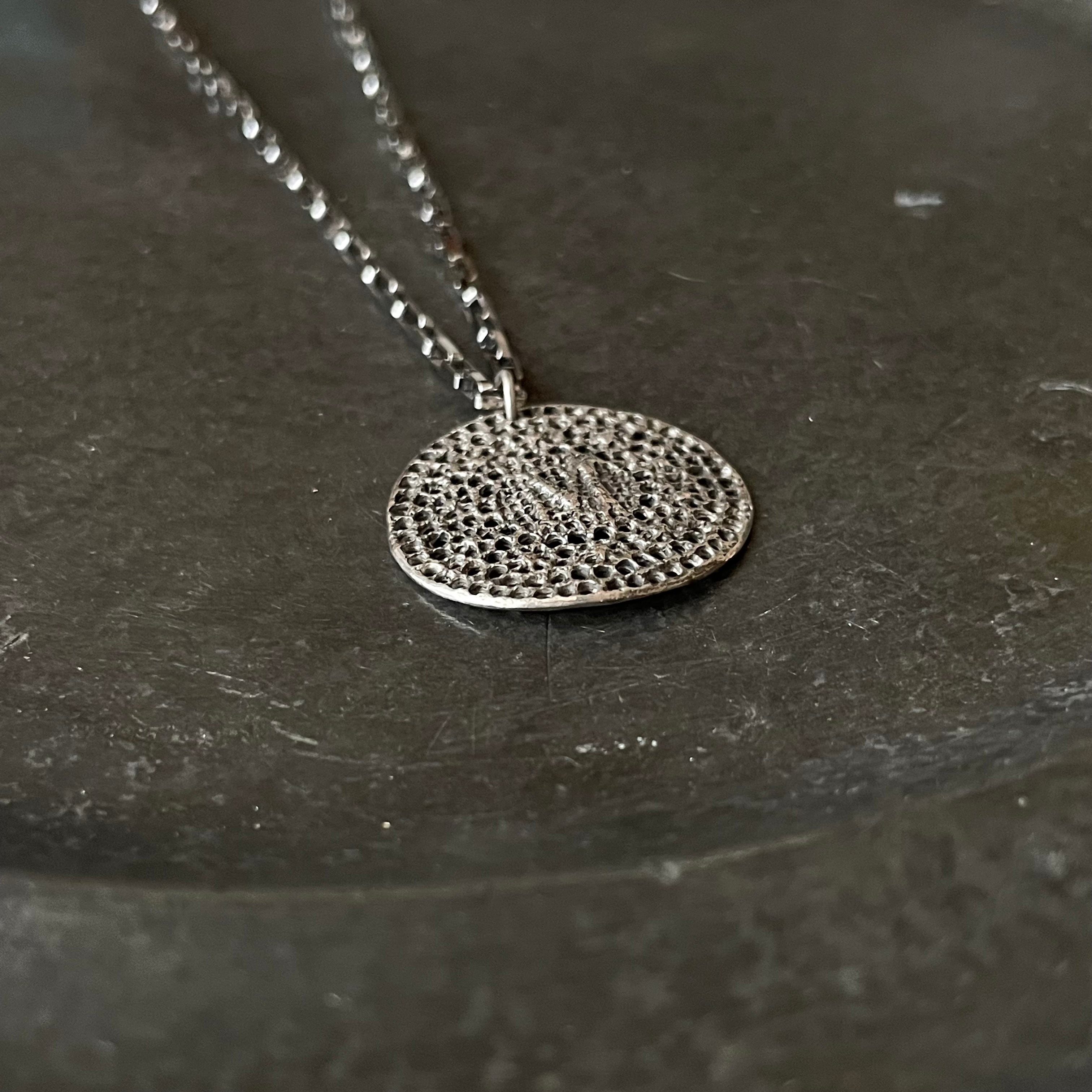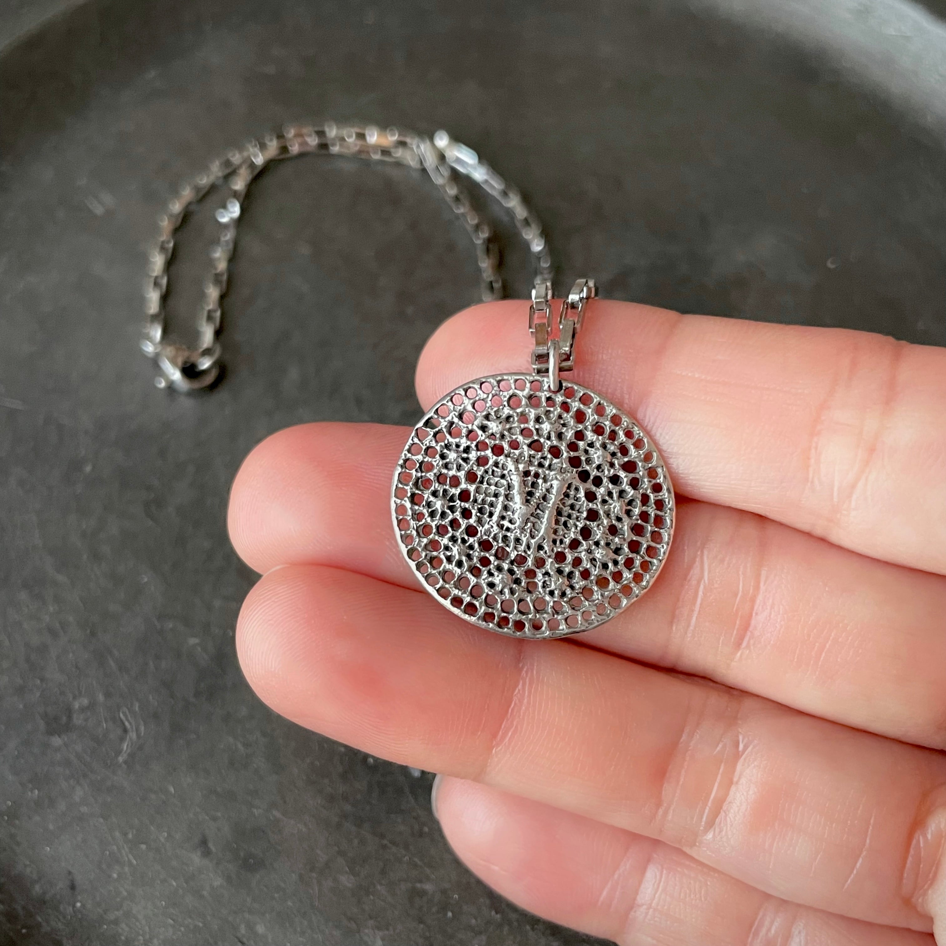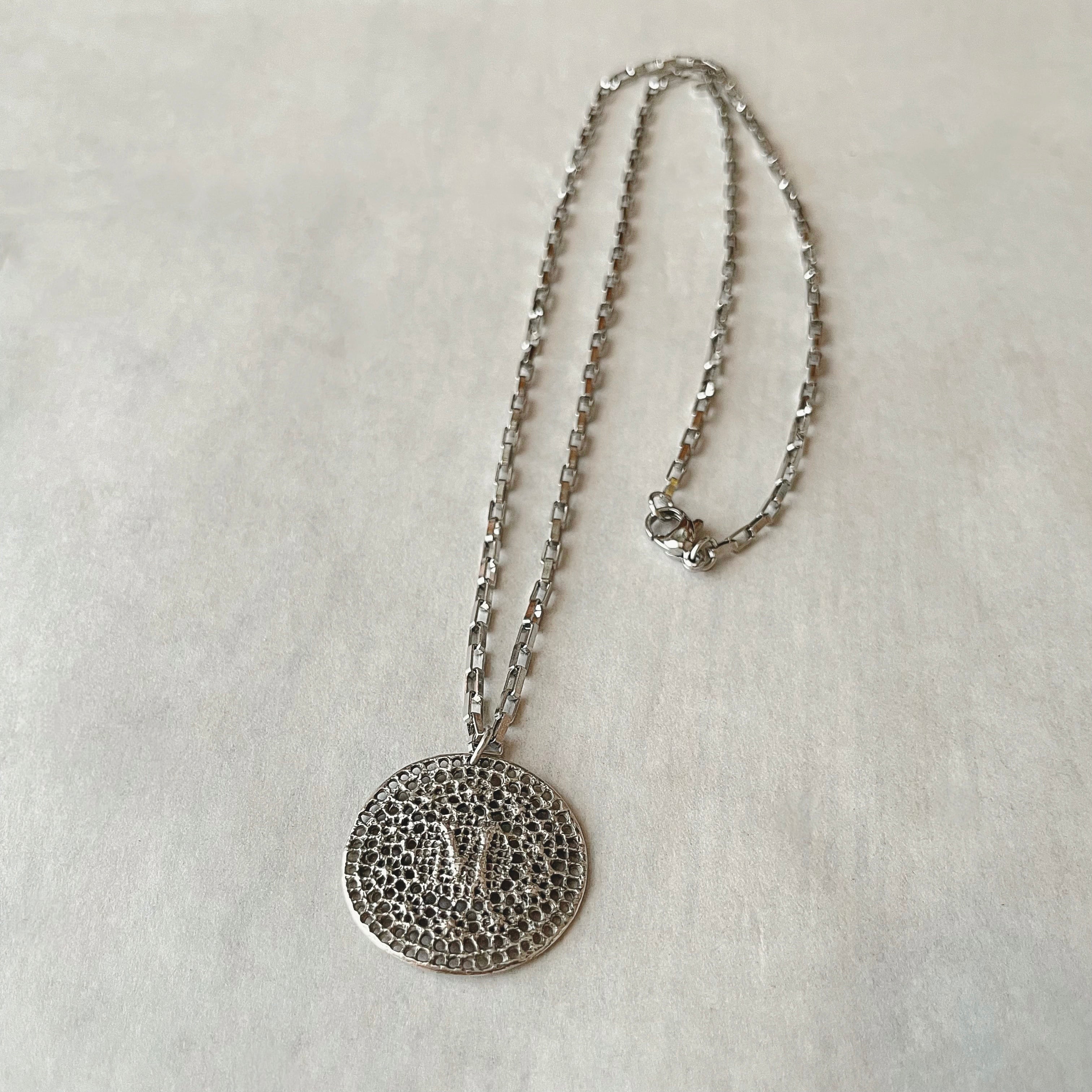繊細で素朴な雰囲気のアンティーク刺繍をシルバーメダルに仕立てアンティーク仕上げにしました。