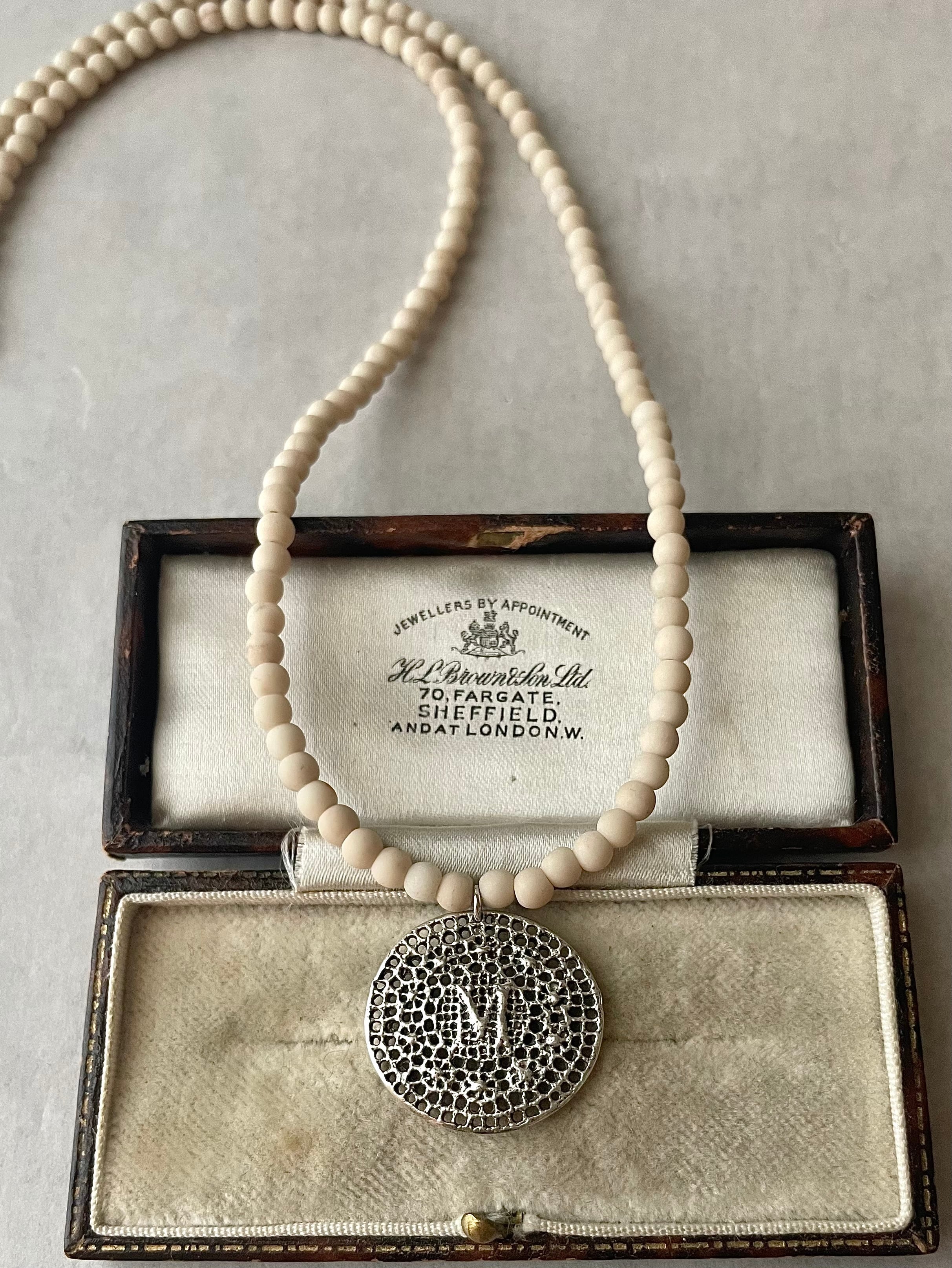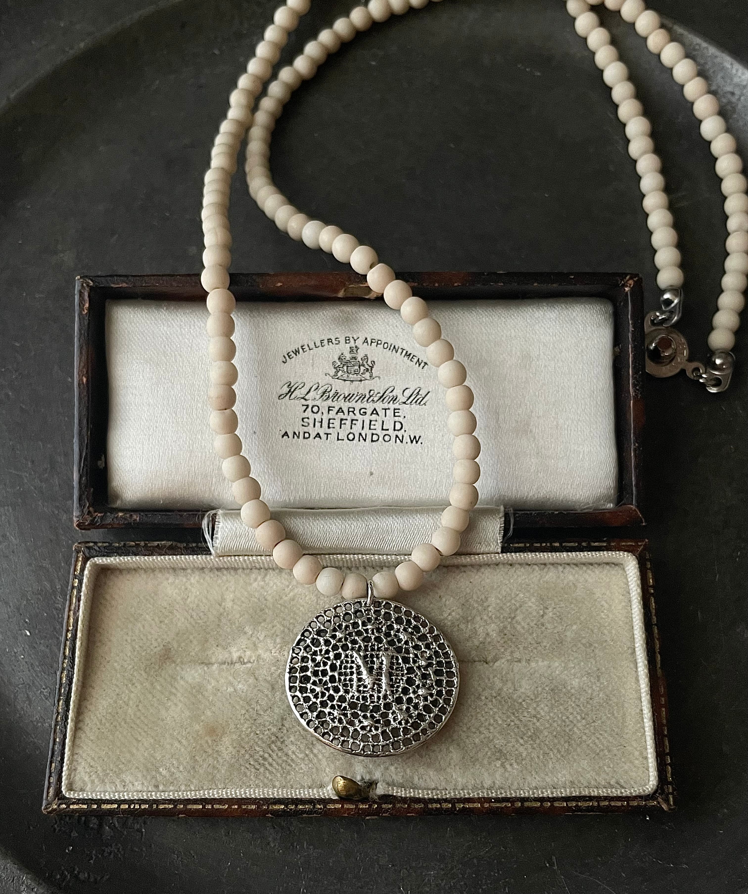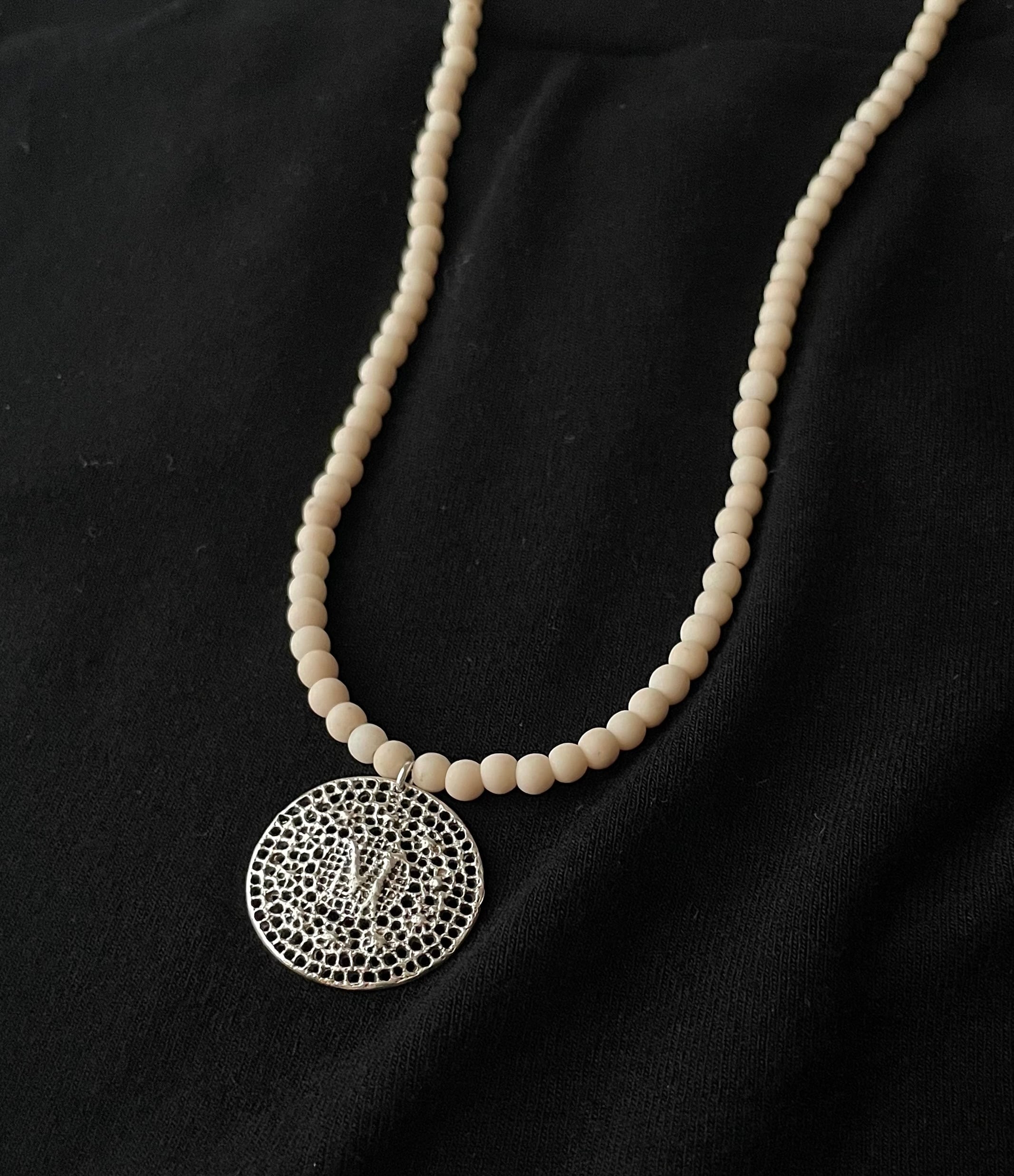 艶消しのリバースストーンとアンティーク仕上げの刺繍メダルは落ち着いた上品な雰囲気のネックレスで大人のアイテムとしておすすめです。