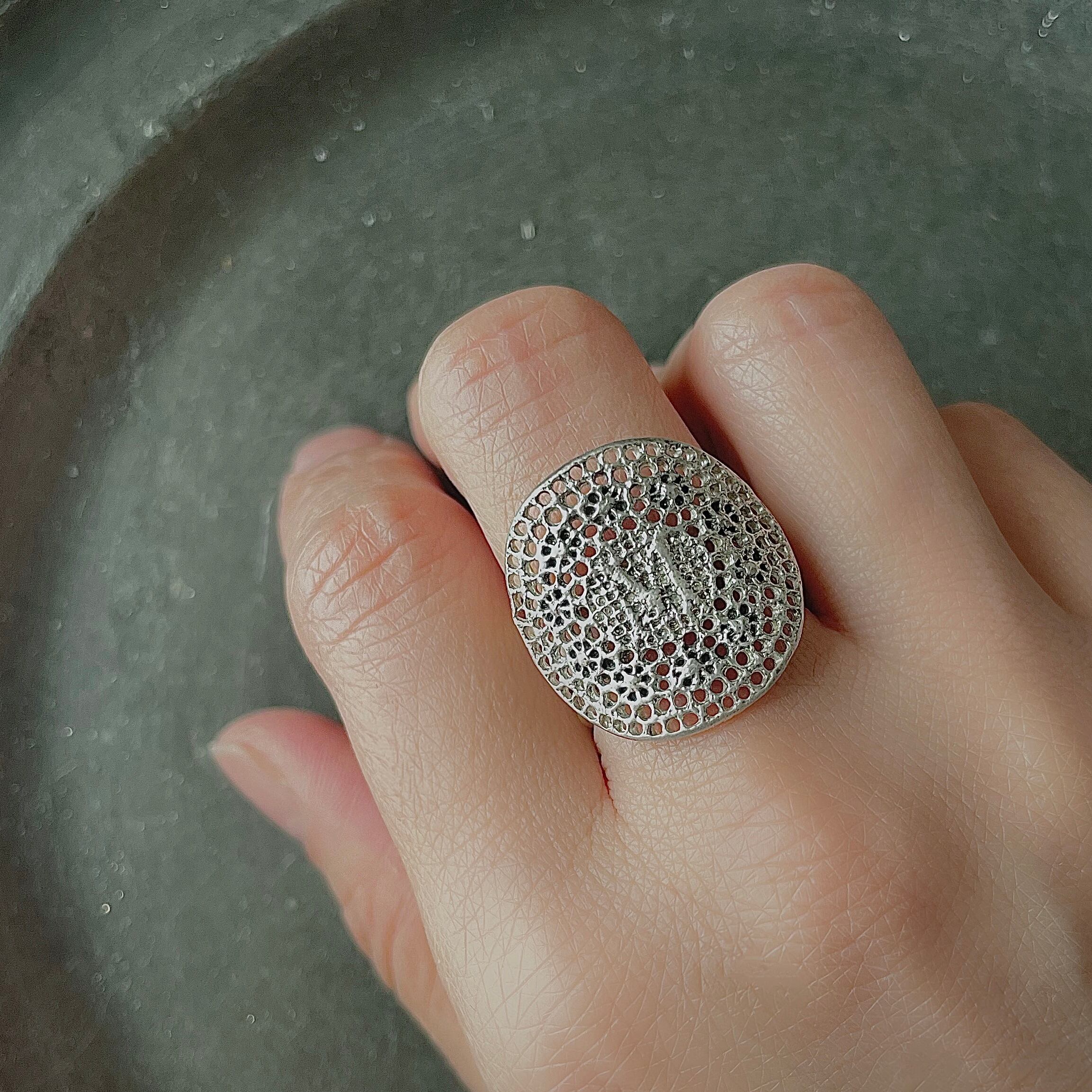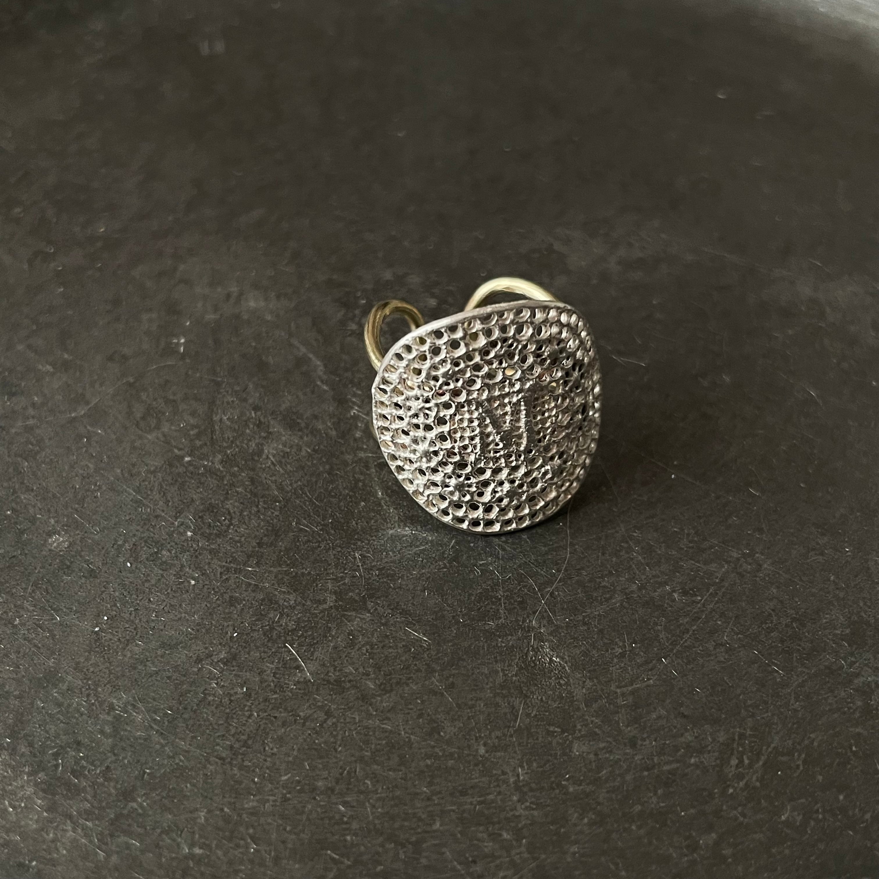 アンティークのイニシャル刺繍をシルバーに鋳造し、モチーフをリングにしました。