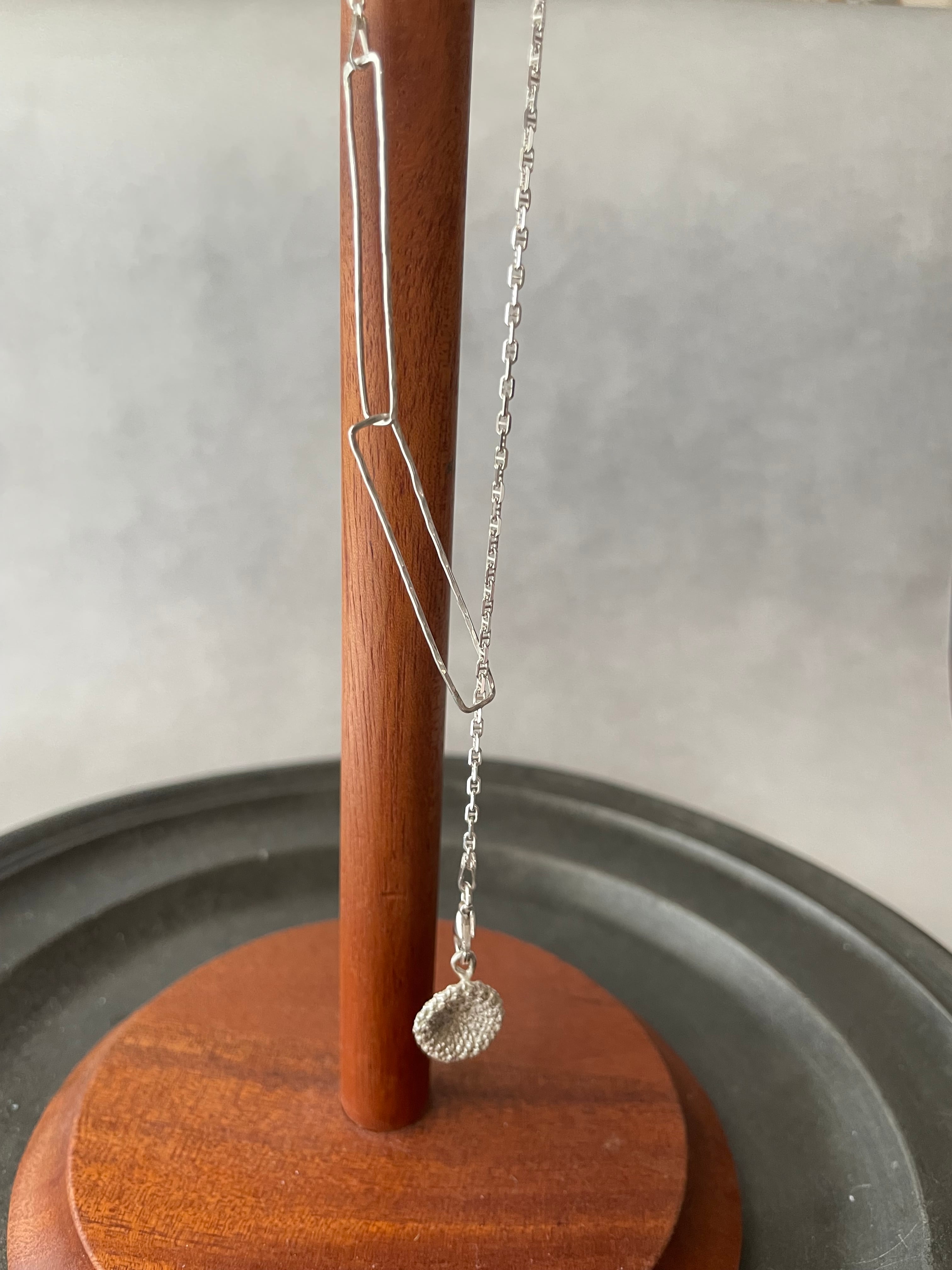 鎚目のスクエアパーツとニット模様のラウンドパーツの組み合わせで色々なアレンジをお楽しみ頂けるシルバーネックレスです。